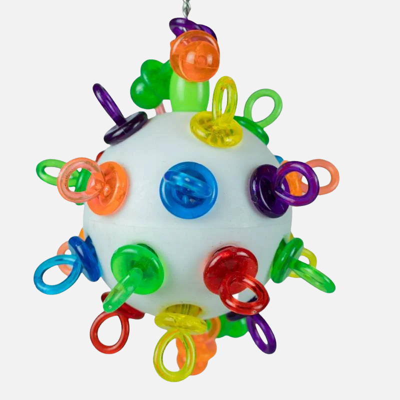 Breng kleur en plezier in de kooi met de Petlala Super Binkies Hanging Wiffle Ball. Dit opvallende speeltje bestaat uit een stevige kunststof bal met kleurrijke ringen en kralen die in alle richtingen uitsteken. Het ontwerp stimuleert het natuurlijke speel- en kauwgedrag van vogels en zorgt voor eindeloos vermaak.